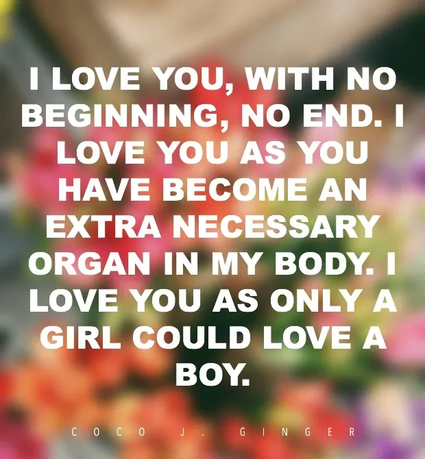 42. „Milujem ťa bez začiatku. Milujem ťa, pretože si sa stal mimoriadne potrebným orgánom v mojom tele. Milujem ťa, pretože iba dievča mohlo milovať chlapca. Bez strachu. Bez očakávaní. Nechcem na oplátku nič okrem toho, že mi dovolíš, aby si ťa tu udržal v mojom srdci, že môžem vždy poznať tvoju silu tvoje oči a tvojho ducha, ktorý mi dal slobodu a nechal ma lietať. “ - Coco J. Ginger